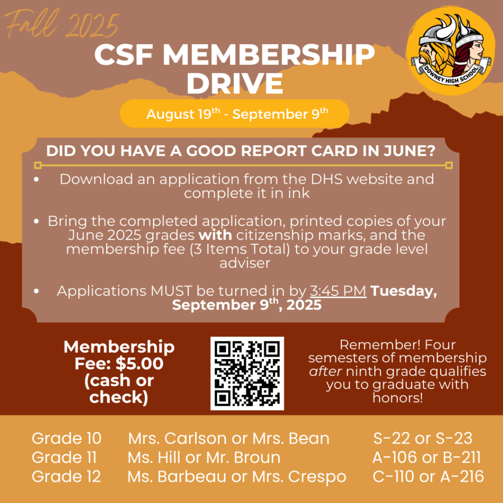 CSF Fall Membership Drive Aug 20, 2025 | News & Announcements CSF Membership drive begins Tuesday, August 19th and ends Tuesday, September 9th BY 3:45PM! Visit the CSF page for Application and Course Link….