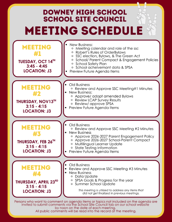 School Site Council Meeting + Add to Google Calendar + iCal / Outlook export 00 days 00 hours 00 minutes 00 seconds Date Nov 13 2025 Ongoing... Time 3:15 am Category School Site Council Share this event Search for: CategoriesCategories Select Category 2006 and Older Hall of Fame 2007 Hall of Fame 2008 Hall of Fame 2009 Hall of Fame 2010 Hall of Fame 2012 Hall of Fame 2013 Hall of Fame 2015 Hall of Fame 2017 Hall of Fame 2019 Hall of Fame 2021 Hall of Fame ASB News & Announcements Athletic News & Announcements Canvas College Information Featured Financial Aid Hall of Fame News & Announcements Technology Uncategorized Yearbook Recent Posts AP Exam Ordering Information CLUB LIST 2025 – 2026 DUSD College Fair Important Dates for Seniors CSF Membership Status – Fall 2025 Lost Device – How to Get a Replacement (English & Spanish) Presentations Senior Checklist 2024-2025 Newsletters Downey vs. Warren Football Game Tickets
