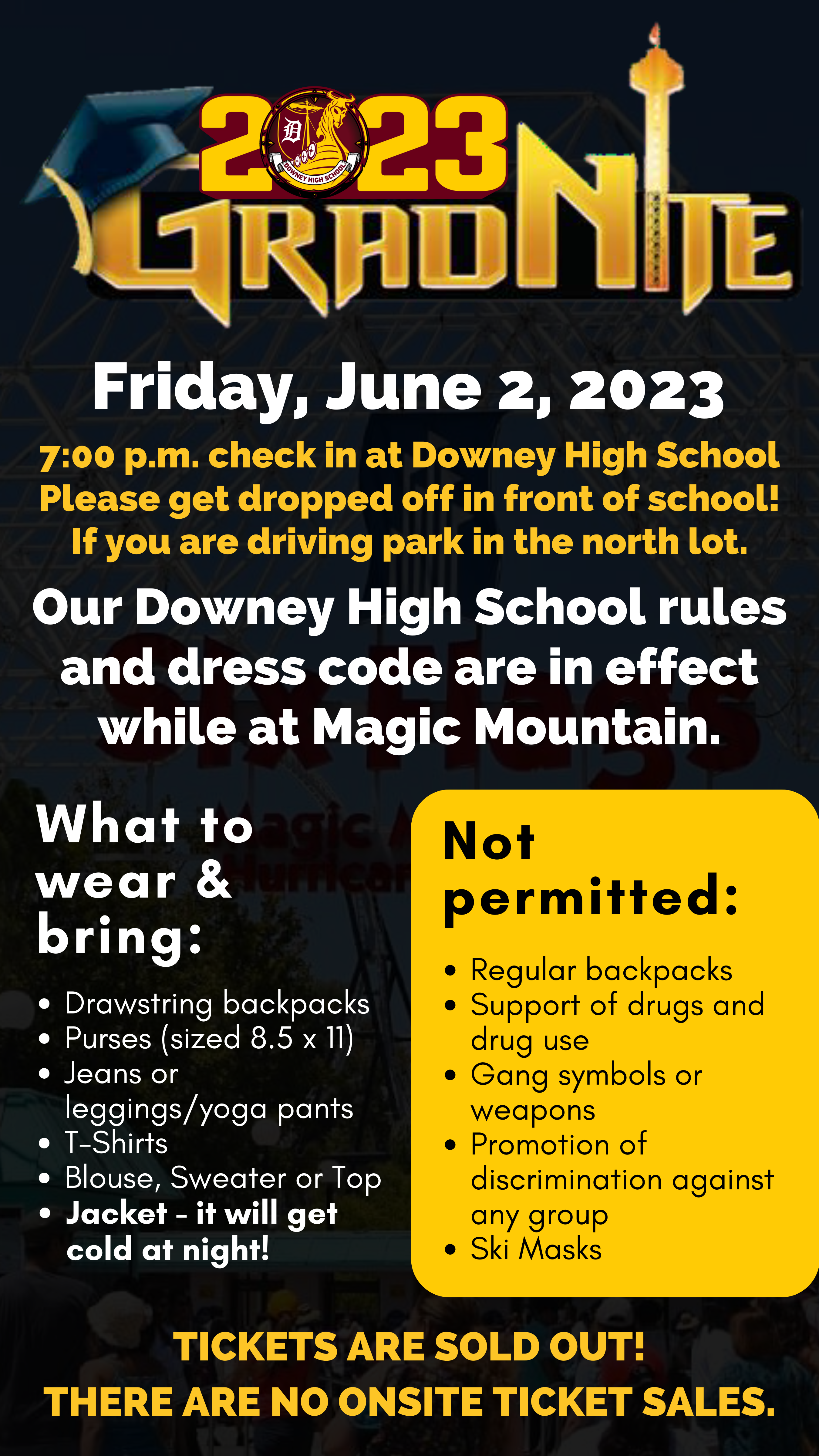 Senior Grad Nite 2024 + Add to Google Calendar + iCal / Outlook export The event is finished. Date May 31 2024 Expired! Time All Day Location Six Flags Magic Mountain 26101 Magic Mountain Pkwy, Valencia, CA 91355 Category Off Site School Event Seniors Share this event Search for: CategoriesCategories Select Category 2006 and Older Hall of Fame 2007 Hall of Fame 2008 Hall of Fame 2009 Hall of Fame 2010 Hall of Fame 2012 Hall of Fame 2013 Hall of Fame 2015 Hall of Fame 2017 Hall of Fame 2019 Hall of Fame 2021 Hall of Fame ASB News & Announcements Athletic News & Announcements Canvas College Information Featured Financial Aid Hall of Fame News & Announcements Technology Uncategorized Yearbook Recent Posts Finals Week Schedule 2026 DHS Grad Nite ELAC Meeting | 12.10.25 CLUB LIST 2025 – 2026 DUSD College Fair Important Dates for Seniors CSF Membership Status – Fall 2025 Lost Device – How to Get a Replacement (English & Spanish) Presentations Senior Checklist