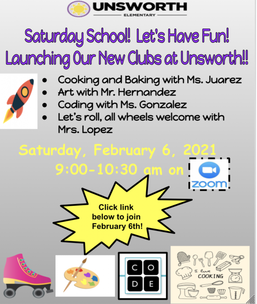 Exciting news Suns! We are having Saturday School and launching new clubs at Unsworth via Zoom.
