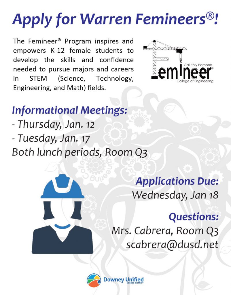 Apply for Warren Femineers®! The Femineer® Program inspires and empowers K-12 female students to develop the skills and confidence needed to pursue majors and careers in STEM Science, Technology, Engineering, and Math) fields.