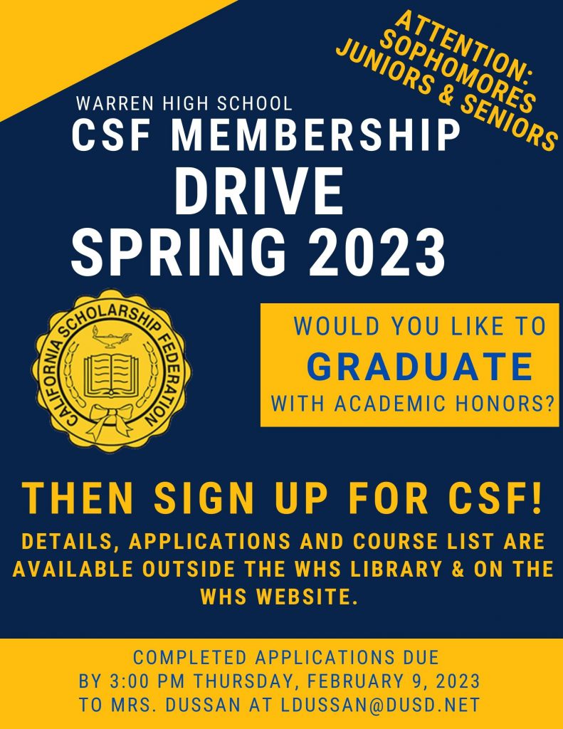 The CSF Spring 2023 Membership Drive is going on now. Details, applications and course list are available on our school website and outside the Library. The last day to submit the application is Thursday, February 9th, 2023.