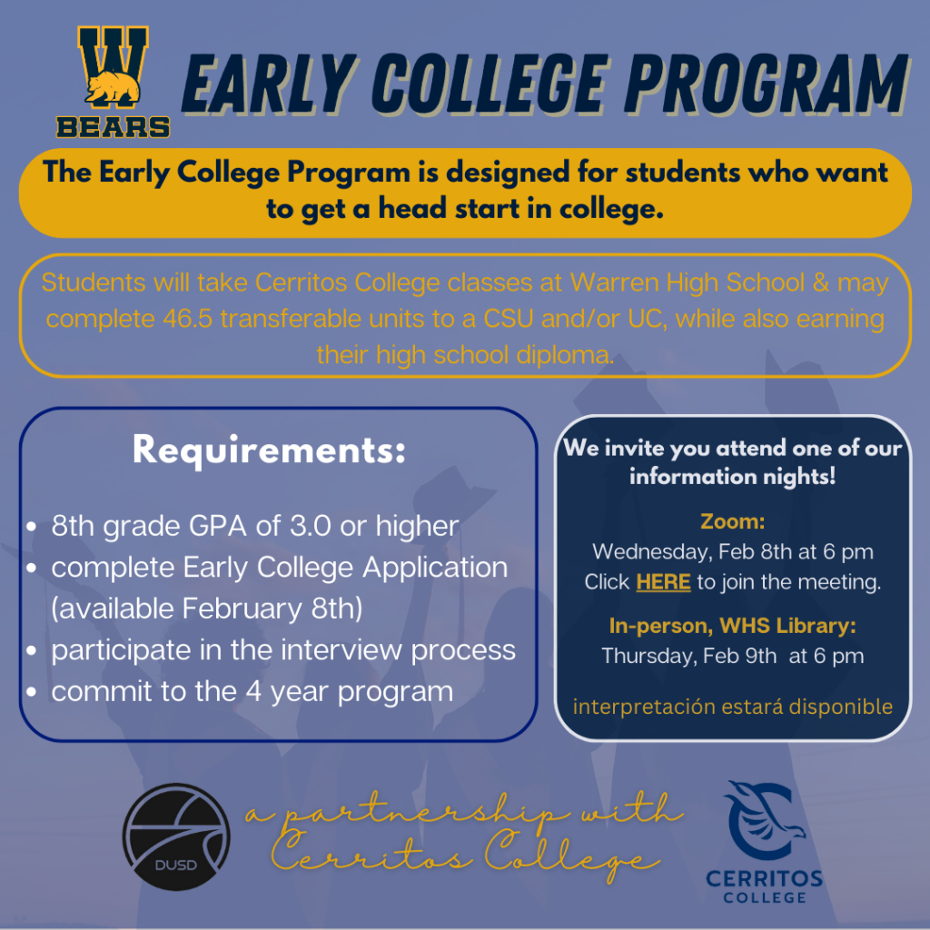 Warren High School invites current 8th grade students and families to attend an informational meeting about the Early College program that will be offered next year at Warren High School (WHS).