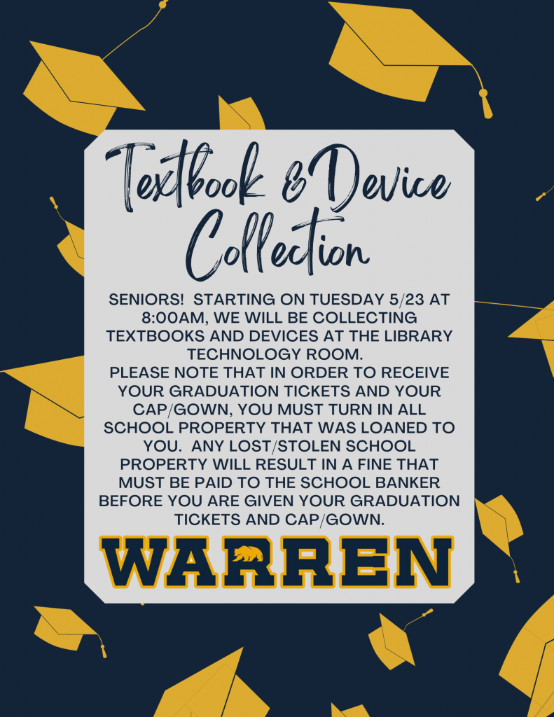 Seniors, all devices and textbooks must be returned before you can collect your cap & gown and graduation tickets. All debts will also need to be cleared before pick up. Devices and Textbooks can be returned to the Library Technology Room starting on Tuesday 5/23 @ 8:00am.