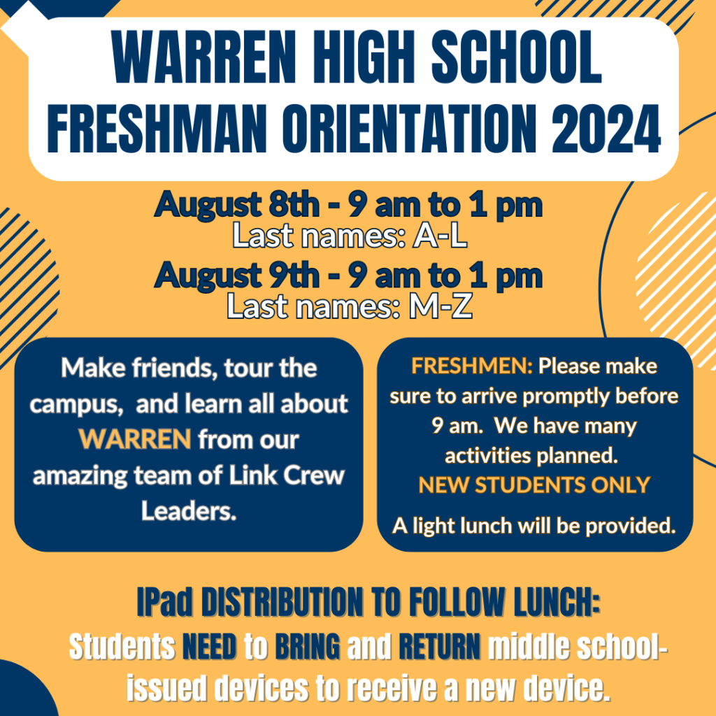 Save the date for Freshmen Orientation on Thursday 8/8 for last names A-L and Friday 8/9 for last names M-Z. Our Link Crew will also host a New Student Orientation on Tuesday 8/13 for new incoming 10-12th graders.