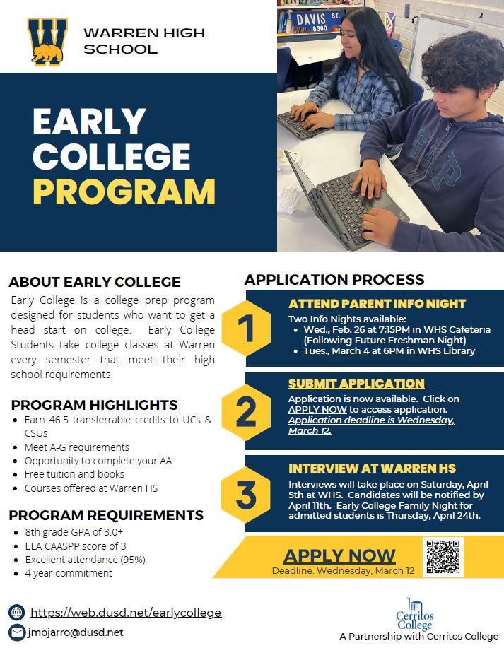 Attention Future Bears! Are you interested in applying to join our Early College Program where you can take Cerritos College classes at Warren High School? If you are, then you will need to attend a Parent Info Night: Tuesday March 4th @ 6:00pm in the WHS Library. Use the link in bio to access the application. All applications are due by Wednesday March 12th.