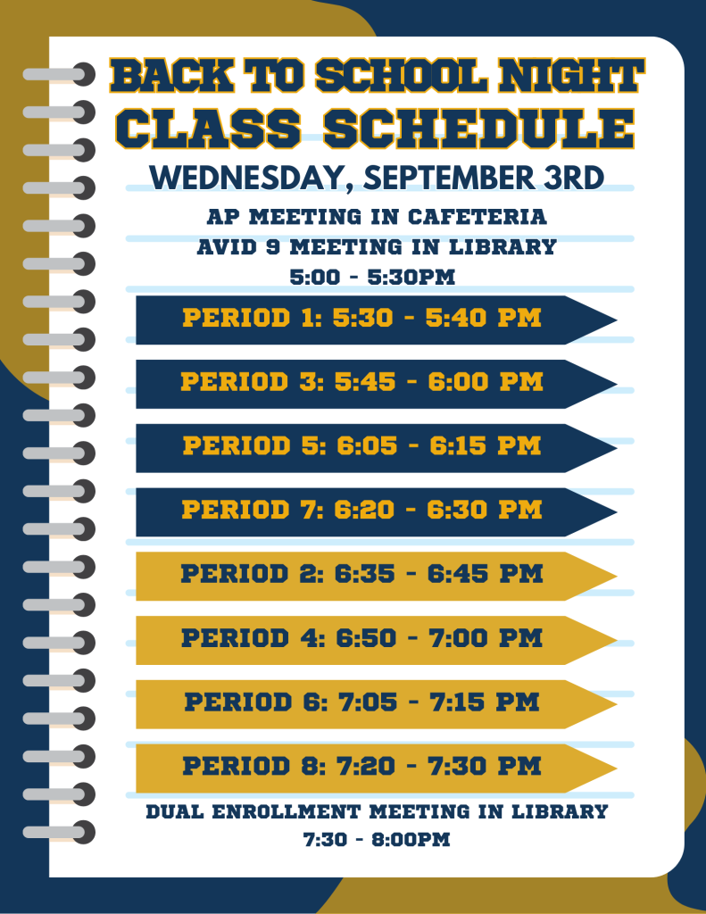 • 5:00 – 5:30 PM: Stop by the Cafeteria to learn about our Advanced Placement (AP) options or visit the Library for an overview of our AVID 9 Course.