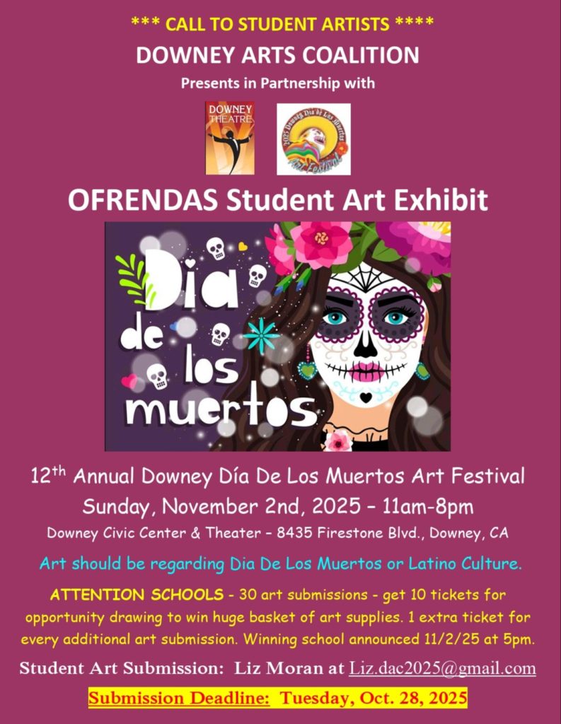 Downey’s 12th Annual Día de los Muertos Art Festival is right around the corner! Join the community on Sunday, November 2, 2025, from 11 AM to 8 PM at the Downey Civic Theater (8435 Firestone Blvd, Downey, CA) for a vibrant day filled with art, music, food, and tradition.