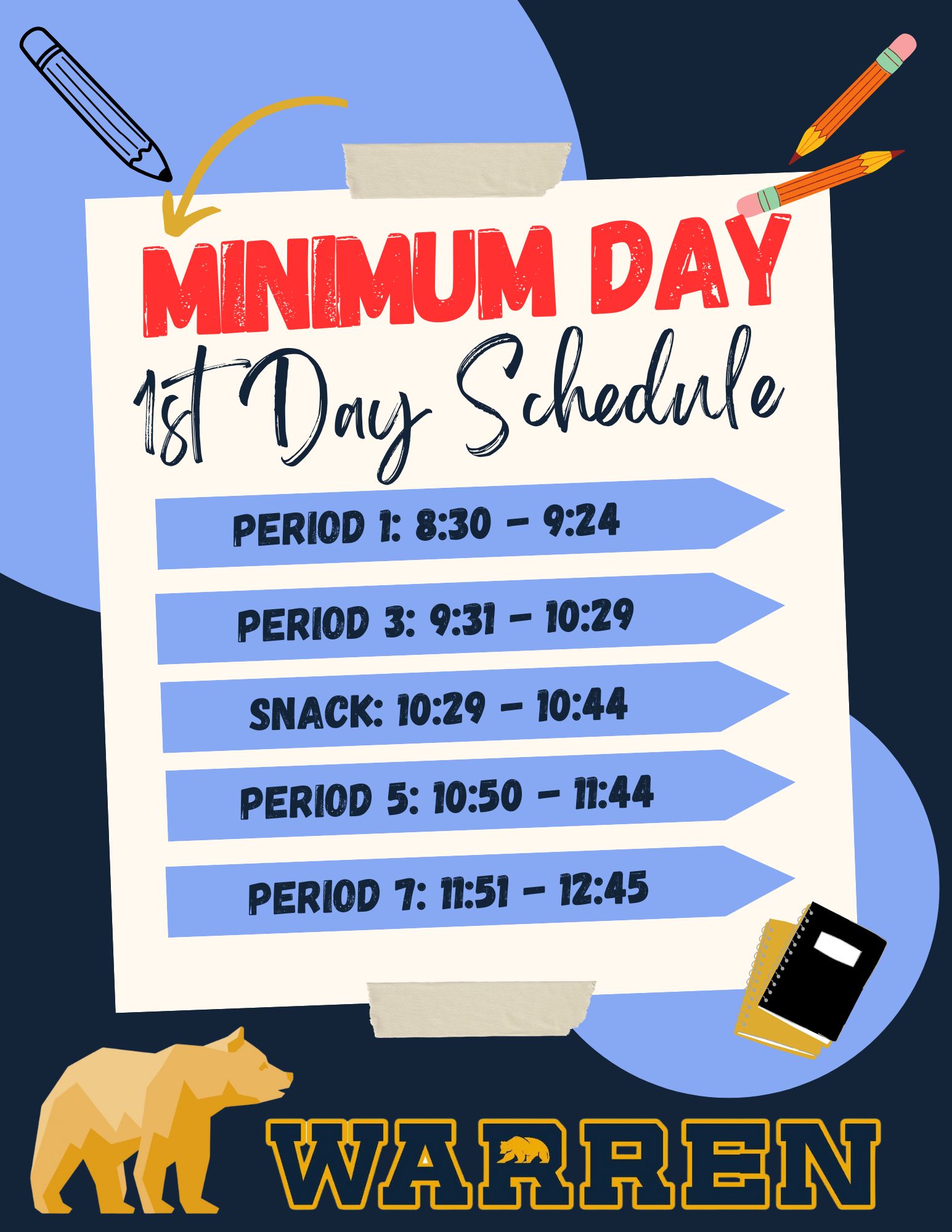 The first day of school will be August 13, 2025. It will be a Blue Day (Periods 1, 3, 5, 7) with a Minimum day schedule.