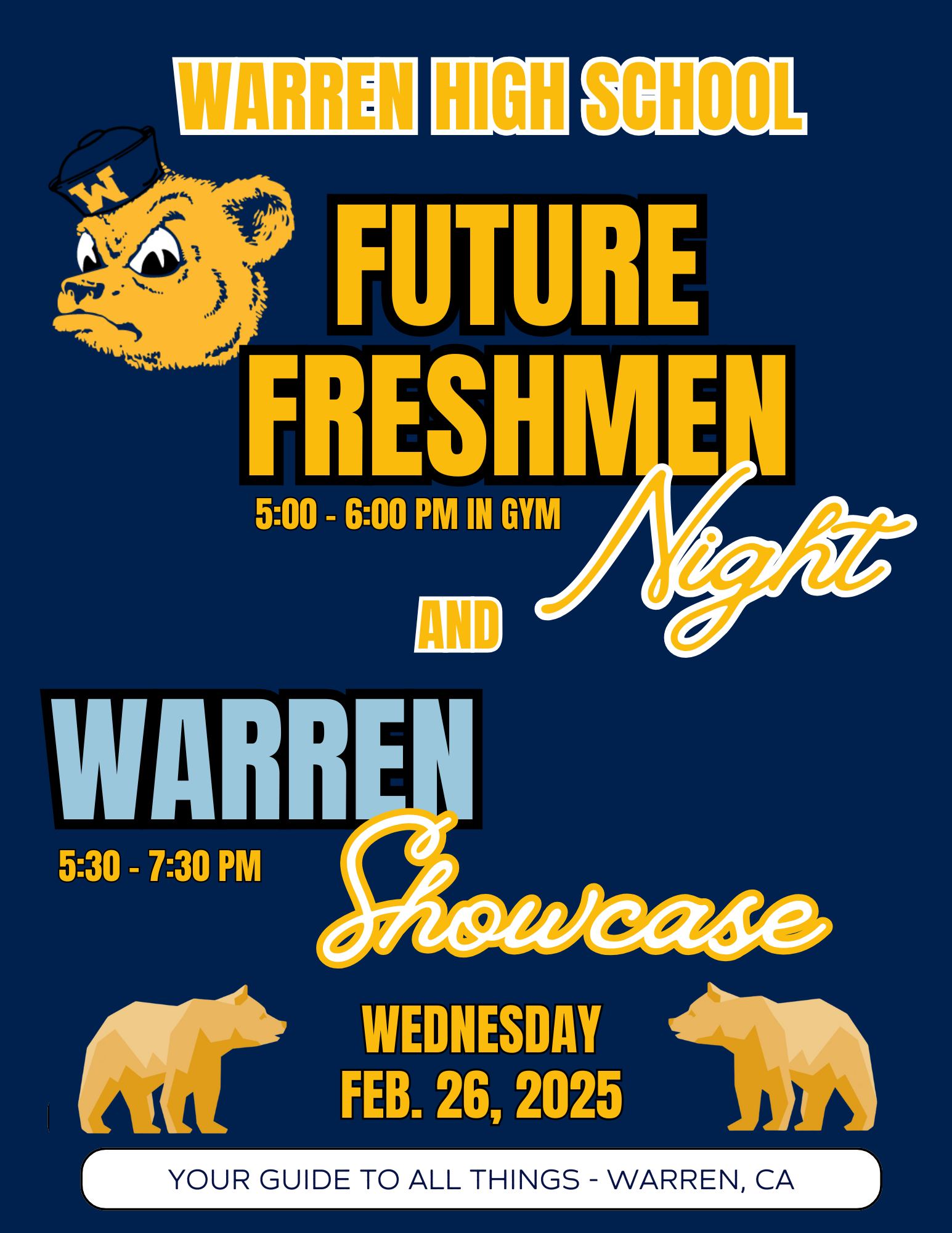 Warren Showcase This is your chance to see all of the amazing programs and opportunities that Warren has to offer. + Add to Google Calendar + iCal / Outlook export The event is finished. Date Feb 26 2025 Expired! Time 5:30 pm - 7:30 pm Category After School Event Share this event Search for: Recent Posts Warm Holiday Wishes from the Warren Community LEAD: Connecting Students to Real Careers and Real Stories Cooking Up Careers in our CTE Culinary Arts Pathway Winter Break Schedule. Happy Holidays! Character Counts! Holiday Spirit Week: December 8–12 Recent CommentsArchives December 2025 November 2025 October 2025 September 2025 August 2025 July 2025 June 2025 May 2025 April 2025 March 2025 February 2025 January 2025 December 2024 November 2024 October 2024 September 2024 August 2024 July 2024 June 2024 May 2024 April 2024 March 2024 February 2024 January 2024 December 2023 November 2023 October 2023 September 2023 August 2023 June 2023 May 2023 April 2023 March 2023 February 2023 January 2023 December 2022 November 2022 October 2022 September 2022 August 2022 July 2022 June 2022 May 2022 April 2022 March 2022 February 2022 January 2022 December 2021 November 2021 October 2021 September 2021 August 2021 July 2021 June 2021 May 2021 April 2021 March 2021 October 2020 March 2017 Categories 2013 Hall of Fame 2014 Hall of Fame 2015 Hall of Fame 2016 Hall of Fame 2017 Hall of Fame Alumni ASB AVID College & Career Resources College Financial Aid Resources Counselors News & Resources CTE Dual Enrollment Featured Hall of Fame News & Announcements ROTC Technology Technology – Canvas Uncategorized Unified Sports Warren Band Fundraisers Warren Band News and Announcements Meta Log in Entries feed Comments feed WordPress.org