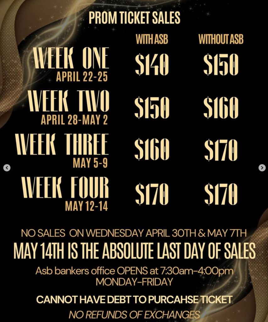 Senior Prom will take place on Saturday May 17th at the Belasco Theater in Downtown Los Angeles. Tickets go on sale Tuesday April 22nd. The last day to buy tickets is Wednesday May14th.