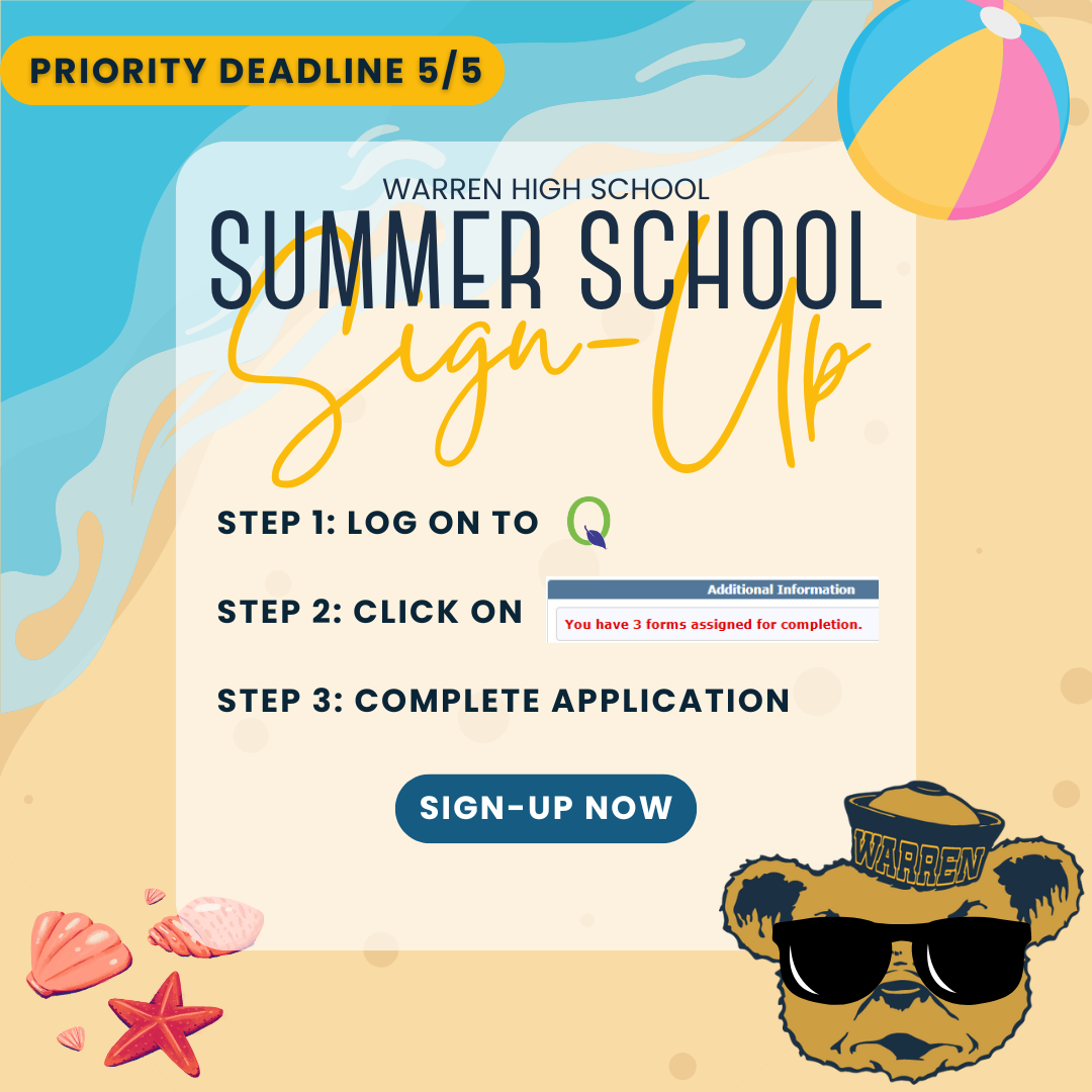 The priority registration deadline for summer school is Monday May 5th. Log on to Q to complete your summer school registration. Summer School starts on Thursday June 12th and ends on Friday July 18th.