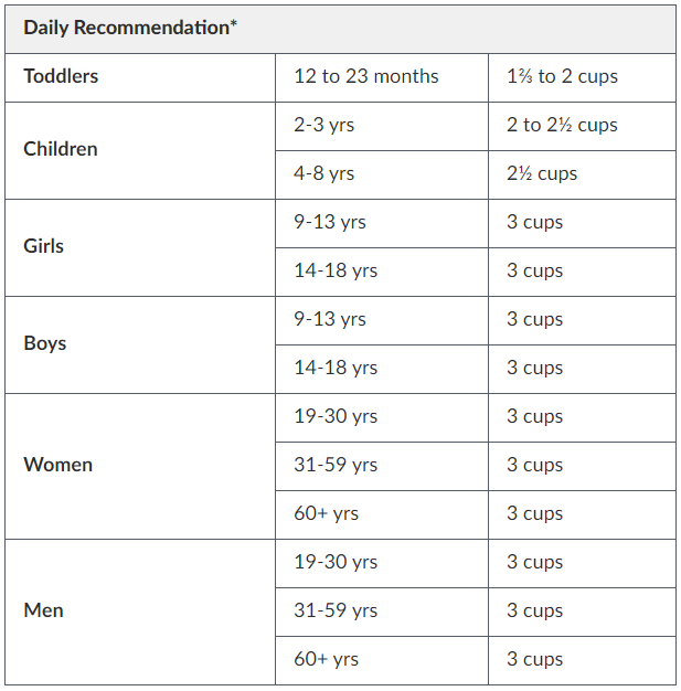 According to the USDA, toddlers are recommended to have 1 2/3 to 2 cups of dairy a day, young children from 2 to 2 1/2 cups per day, and those older than 8 should have 3 cups per day.